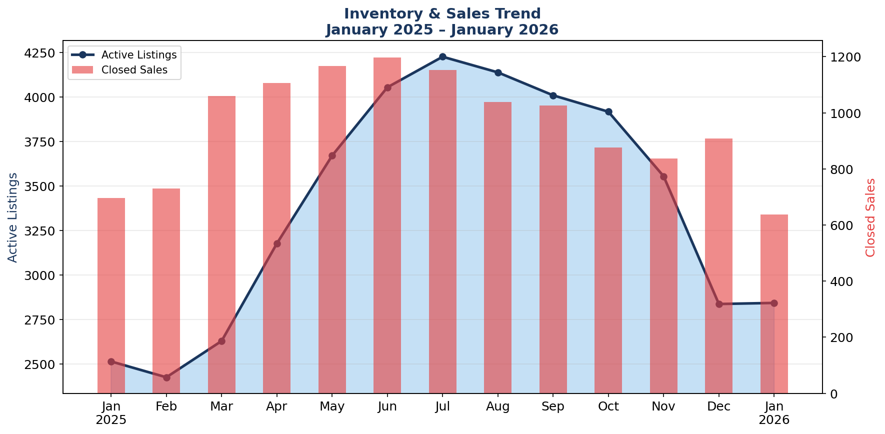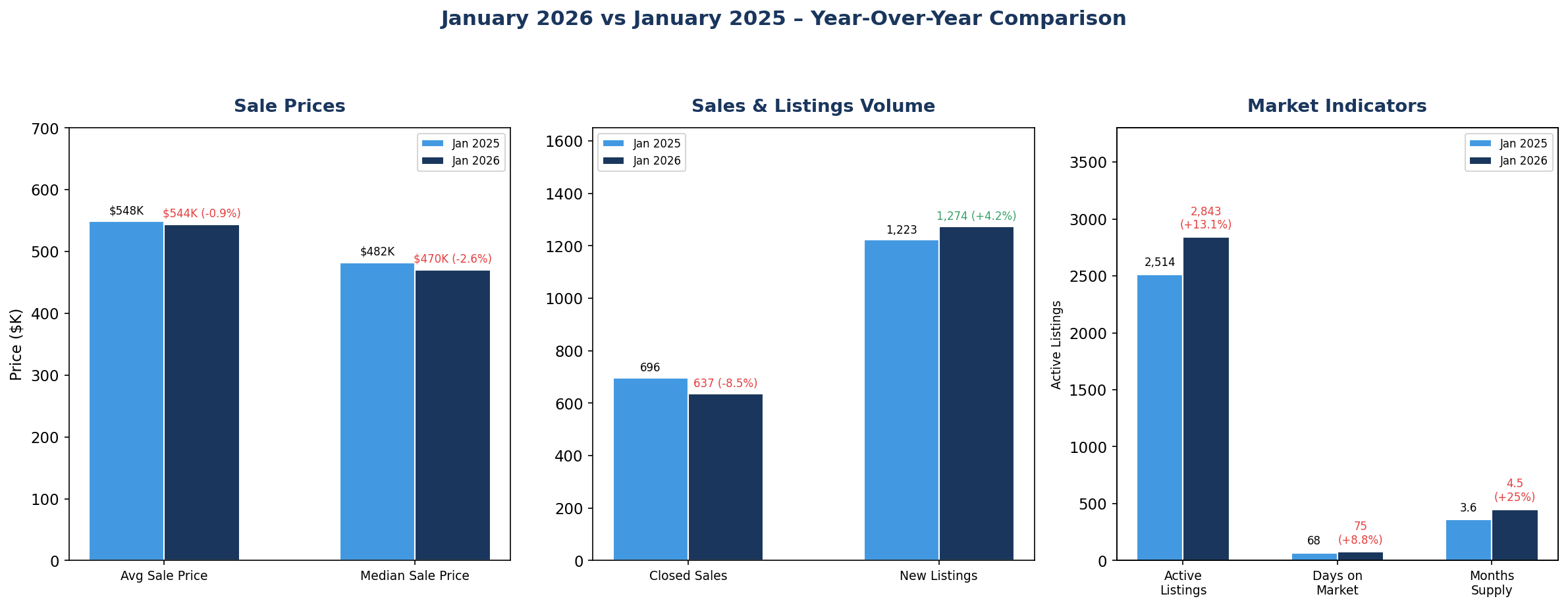 Inventory Insight: Active inventory sits at 2,843 homes – up 13.1% from January 2025’s 2,514 homes and the highest January level in over a decade. While inventory typically rises from winter lows into summer peaks (reaching 4,227 in July 2025), the elevated starting point for 2026 suggests even more inventory ahead this spring. Combined with only 637 closed sales (down 8.5%), this creates a 4.5-month supply – firmly in buyer’s market territory. Sellers need competitive pricing and strong presentation to attract offers.