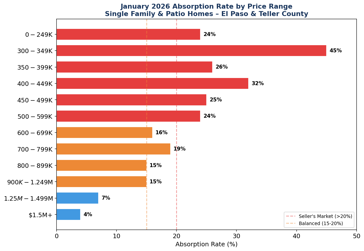 Price Range Analysis: The most competitive price range is $300K–$349K with a 45% absorption rate, followed by $400K–$449K at 32%. The $350–$400K and $500–$600K ranges show balanced conditions around 24–26%. Above $700K, absorption drops to 15–19%, and the luxury market ($1.25M+) strongly favors buyers with only 4–7% absorption rates. Buyers in higher price brackets have exceptional leverage to negotiate.